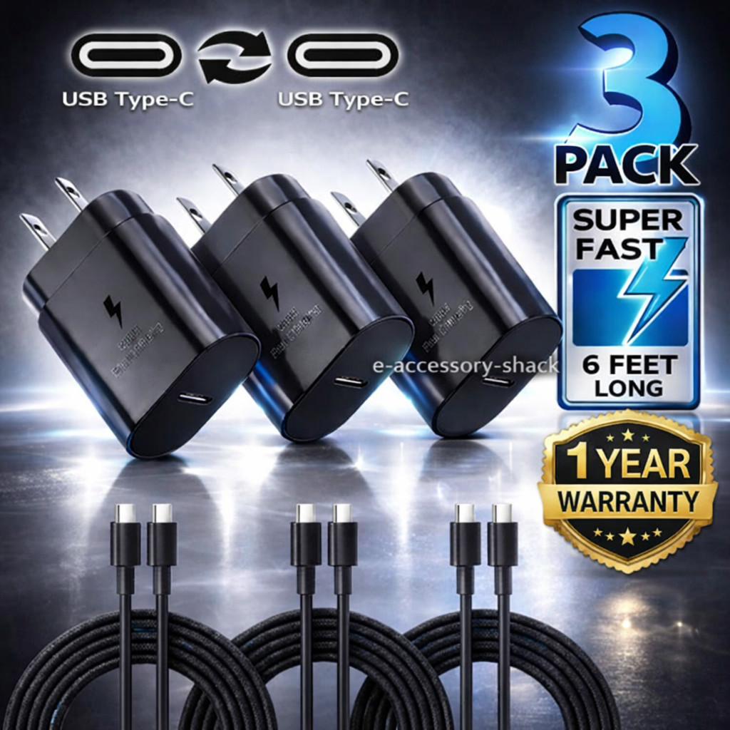 3 Pack 25w USB-C Fast Wall Charger+6ft Cable For Galaxy S25 S24 S23 S22 Ultra +