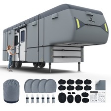 Feature:Made of Waterproof 210D Oxford cloth, up camper cover are much tearing-resistant than other cover, protects your RV from rain, snow, dust and scratches, providing all-weather protection and prolong service life of RV Cover.Adjustable elastic edges and corners provide a custom-made fit to better protect the shell from wind blowing away and tearing.Specification:Color: Silver ToneMaterial: 210D Oxford ClothSize: 1128x274x320cm / 444"x108"x126"(L*W*H)Adaptation Range: fits 33"-37' 5th wheel trailer camperPackage Included:1 x Fifth Wheel Camper Cover1 x Storage Bag4 x Tire Covers2 x Extra Long Windproof Strap4 x bottom buckles Straps6 x Gutter Covers with Sponge2 x Adhesive Repair Patch2 x Weighted Toss Metal Stick.