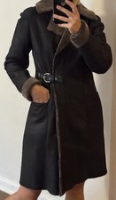 Women’s Black Leather Shearling Coat Jacket Small Fur Trim Belted Winter Pre-owned women’s black leather shearling coat in size Small. This stylish and warm coat features a soft leather exterior with plush shearling-style lining and trim on the collar and cuffs. Designed with a flattering fit, front button closure, side pockets, and a back belt detail for added shape. Condition: Gently worn with normal signs of use. No major damage—please see photos for details. Features: • Size: Small • Color: Black • Material: Leather outer with shearling/faux fur lining • Button front closure • Side pockets • Belted back design • Warm and perfect for fall/winter Great classic piece that never goes out of style!