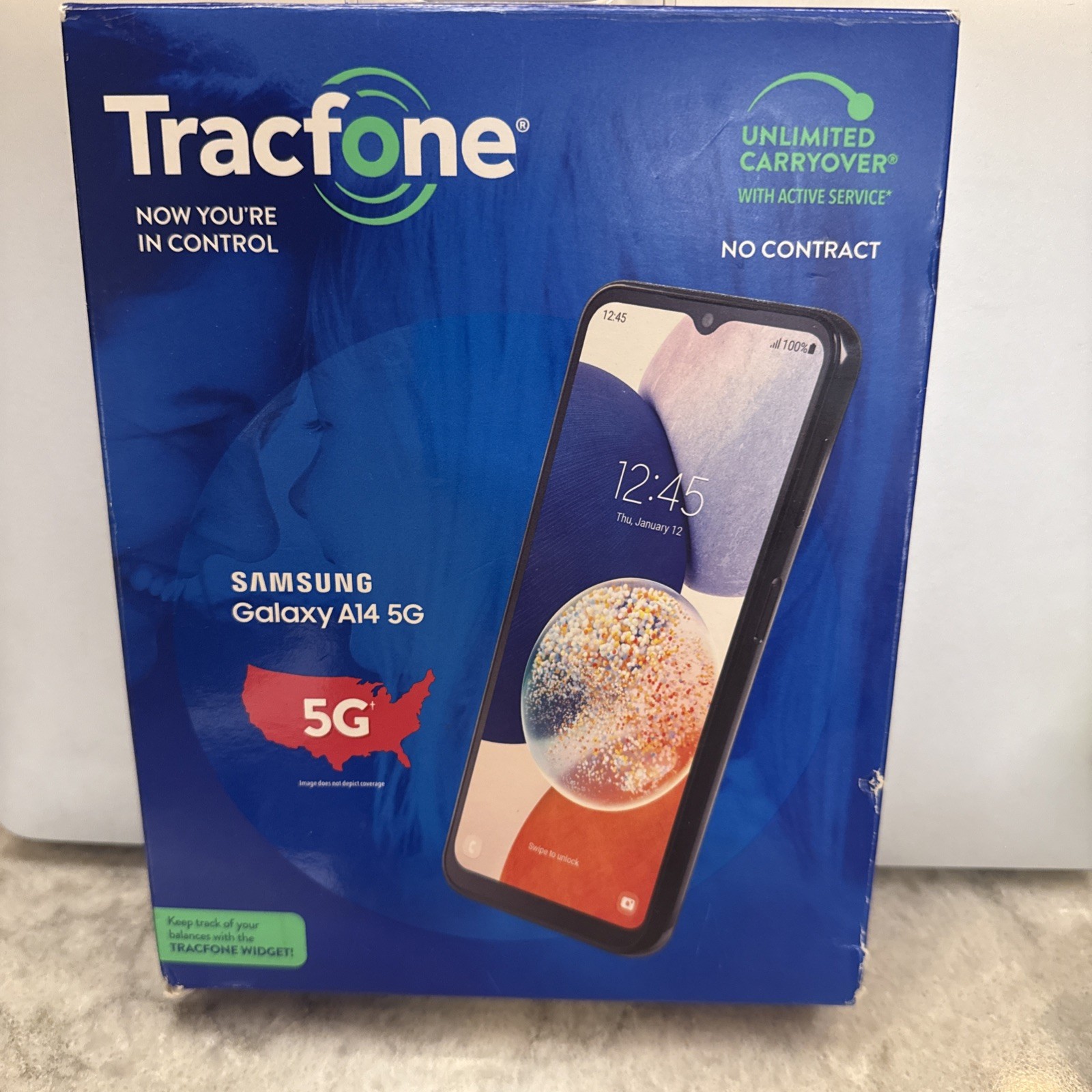 The Samsung Galaxy A14 5G in black with 64GB of storage is a new, sealed box phone designed by TracFone. This sleek device offers high-speed 5G connectivity and a stylish design, perfect for users looking for a reliable and modern smartphone. With ample storage space and a trusted network, this phone is ideal for individuals seeking a dependable and user-friendly mobile device.