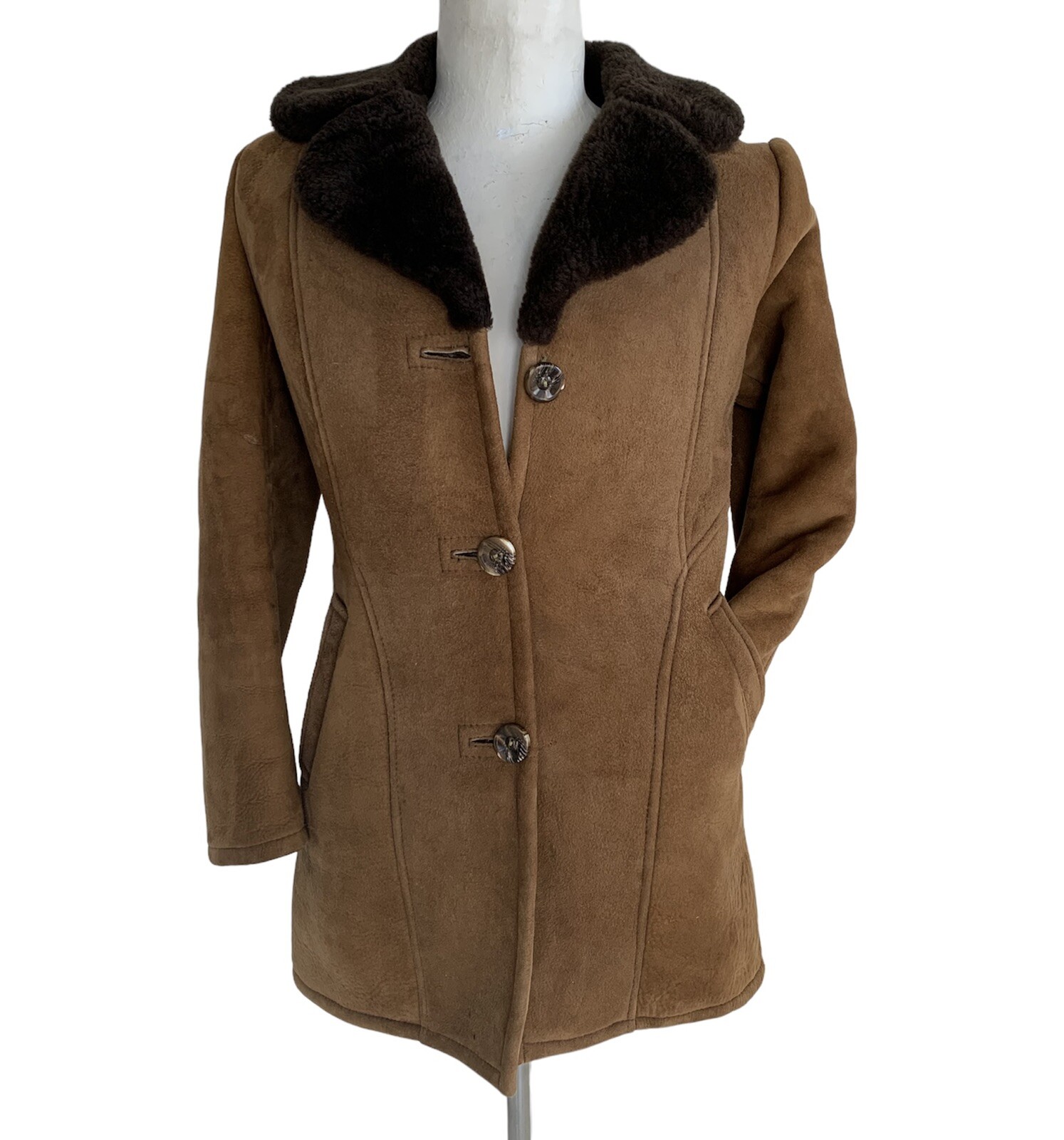 The Sheepskin Factory Women’s Brown Genuine Shearling Lined Winter Coat. 3-Button front. This vintage coat is in very good condition. It has some spots of light wear and matting, but cleans when brushed. No holes or rips. Size 10 Women’s. 100% Wool. Clean condition and ready to wear. Measurements of jacket lying flat: Chest 1: 18.75” Waist 2: 18.25” Sleeve 3: 23” Back 4: 30” I will provide free USPS shipping. Jacket will be neatly folded for shipping. I will ship anywhere in the world for a few. Please message for quotes on international orders
