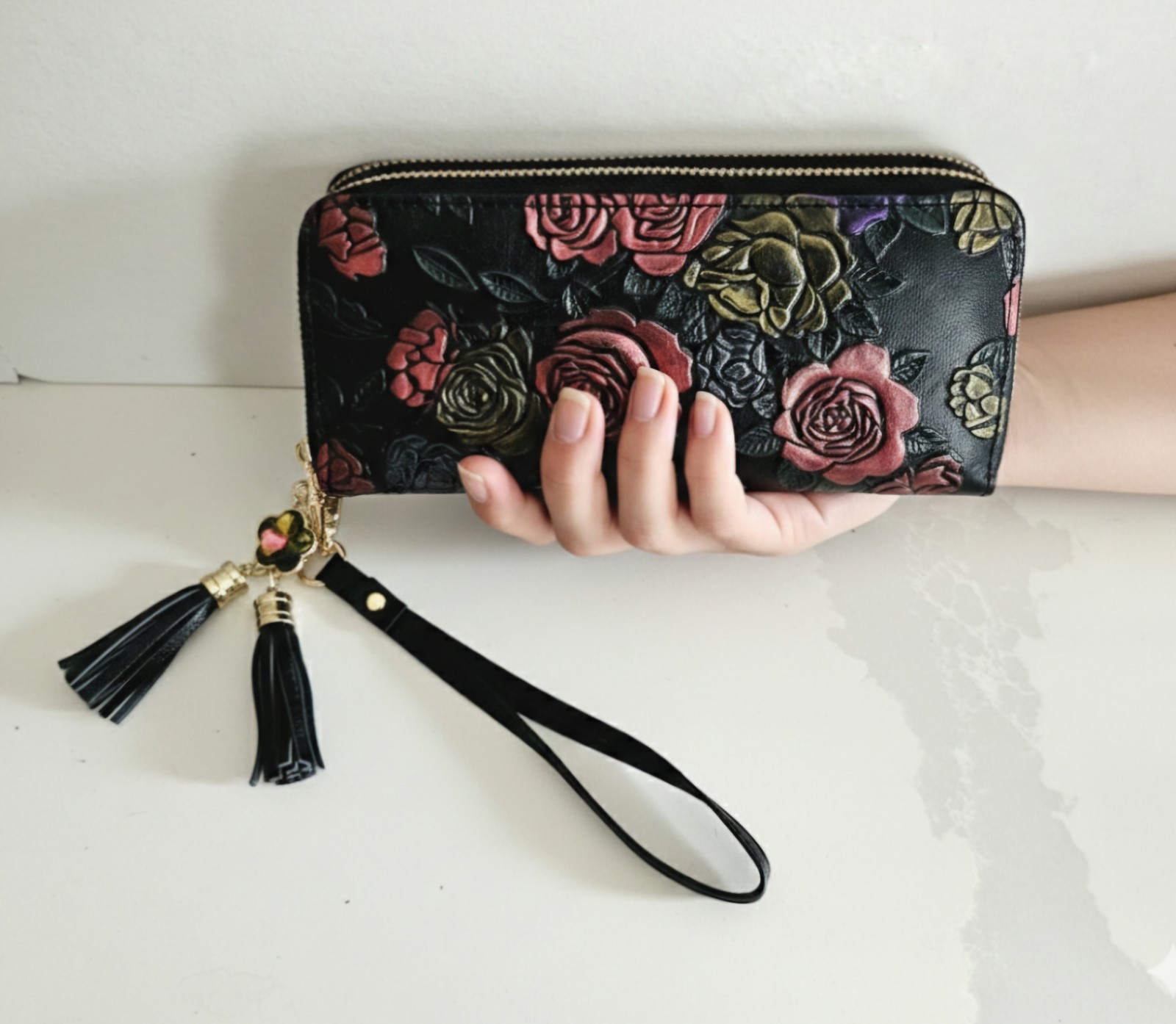 This Embossed Rose Leather Double Zipper Long Wallet Wristlet is a stylish and practical accessory for women. Made of leather with a floral pattern and embossed accents, this clutch wallet features a large capacity with multiple credit card slots ,zipper pocket and detachable strap. The multi-color design adds a fun and feminine touch, making it a perfect accessory to hold all your essentials in one convenient handheld clutch.