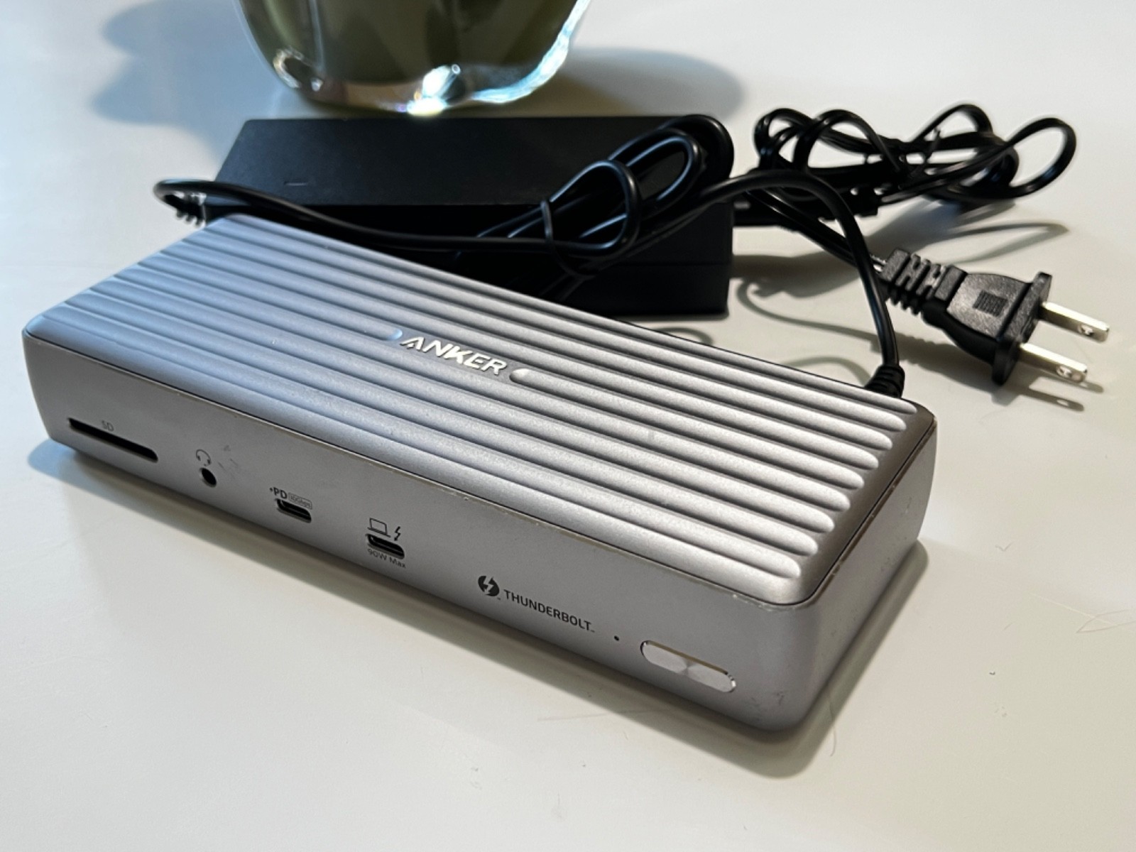 The Anker 777 Thunderbolt 12-in-1 Docking Station (A8397) is a versatile and compact accessory for laptops and desktops. With a sleek silver design, this docking station provides multiple ports including Thunderbolt 1, DisplayPort, HDMI, Ethernet, USB 3.0, and memory card readers. It also features built-in USB ports and can be powered by both AC and USB. The polycarbonate material ensures durability, while the 7.3-inch height and 2.9-inch width make it convenient to use on any workspace. Compatible with universal brands and models, this docking station is a practical solution for expanding your device's connectivity options.