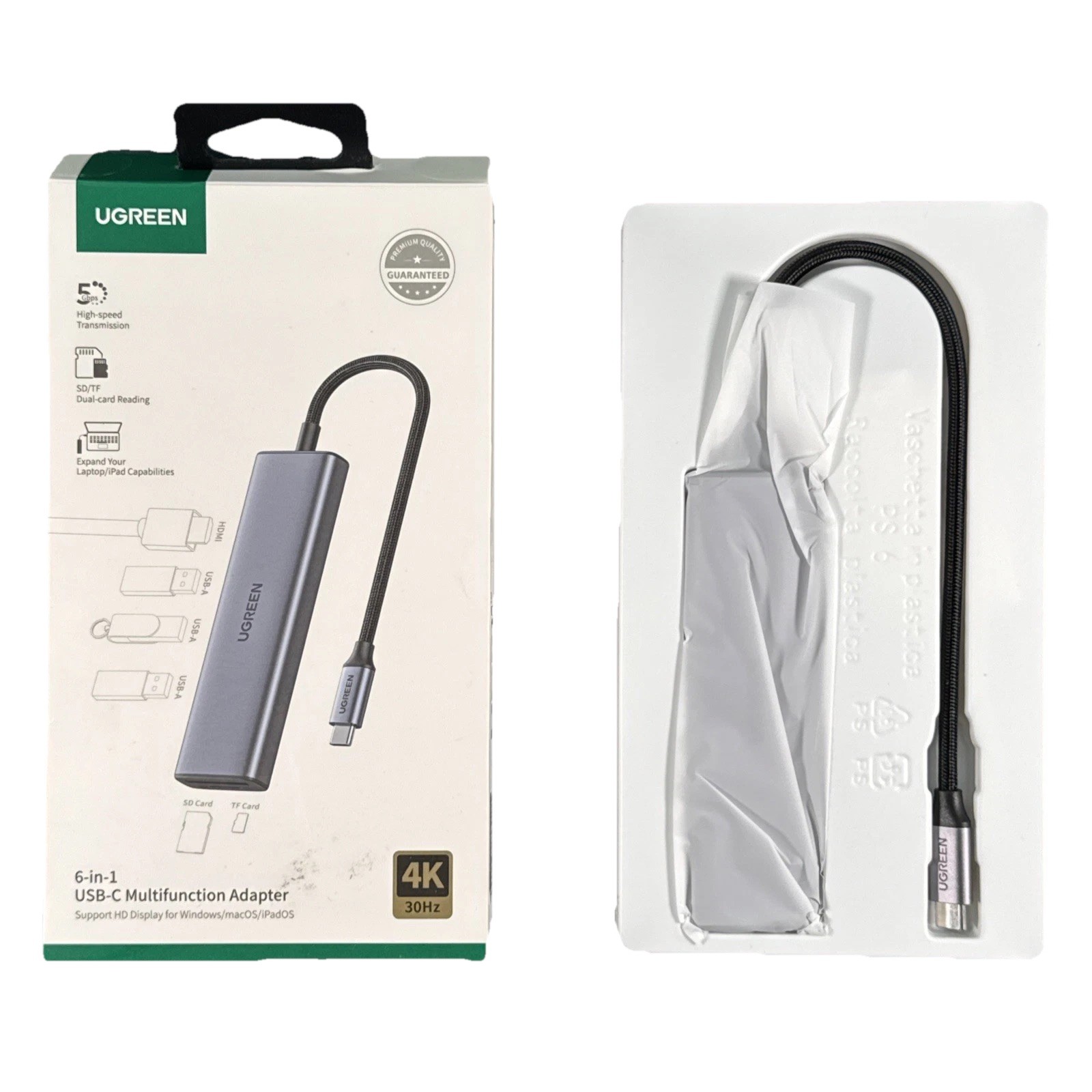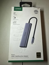 UGREEN 6-in-1 USB-C multifunction hub adapter in open box condition. UGREEN 6-in-1 USB-C hub. 4K HDMI output. TF / microSD card slot. SD card slot. Type: USB-C hub adapter. 3 x USB 3.0 ports.