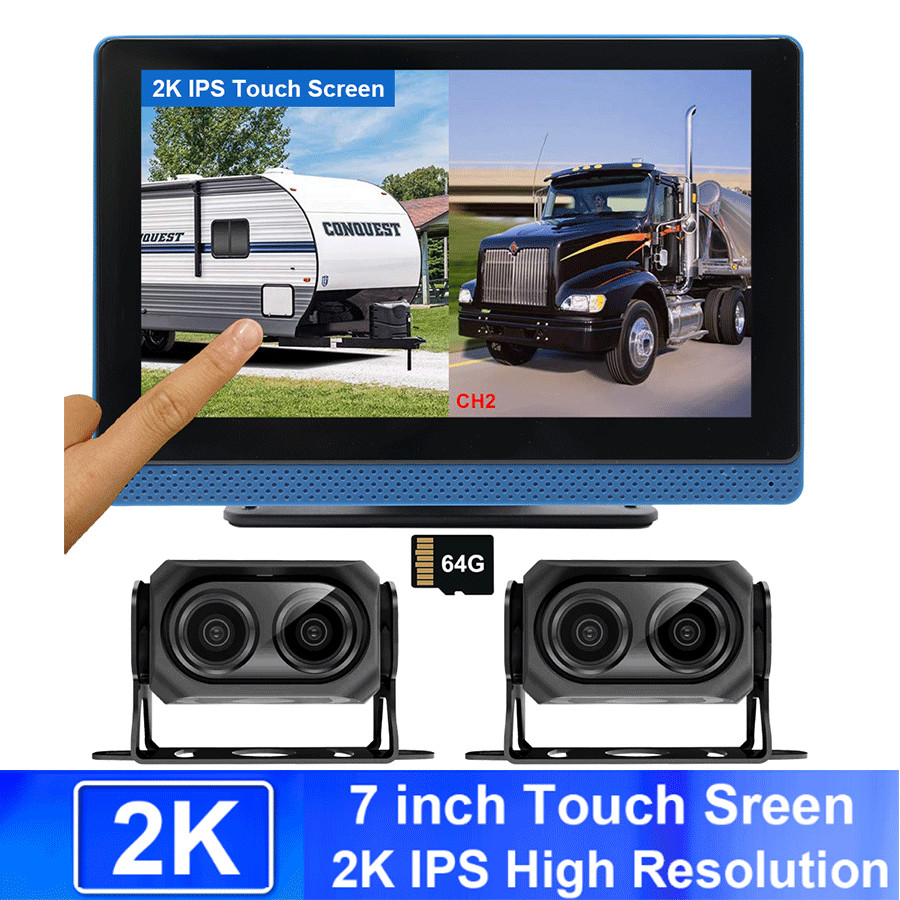 2K Split Touch Screen Dual Recording 12-24V For Truck Caravan Bus. Dual 2K dash cam loop recording, G sensor. Bracket: 360 degree rotating. View Angle: 150 degree. 1 Monitor Bracket. Split screen supports two video inputs.