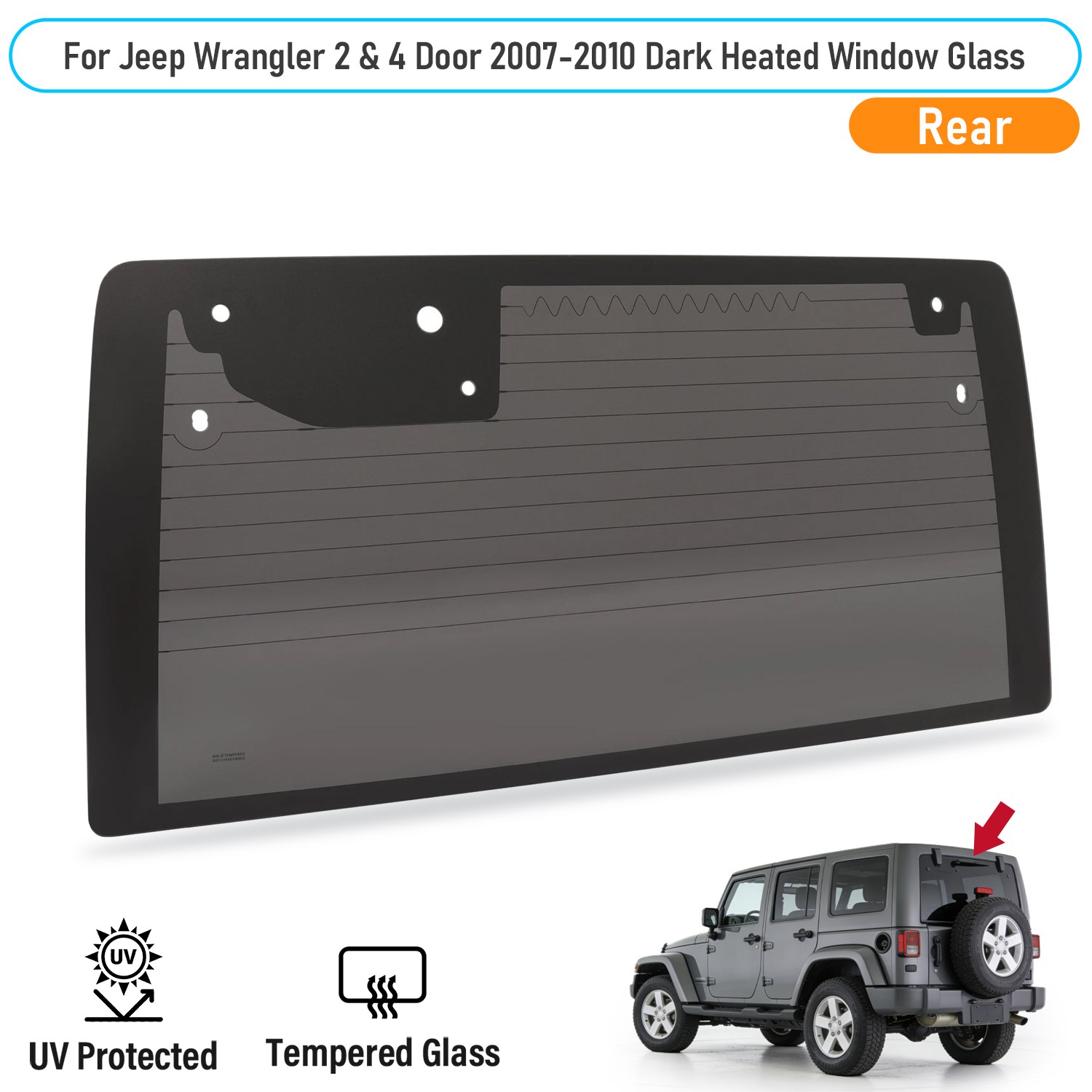 Wrangler 2 & 4 door Utility(Regular,Rubicon,Sahara,& Unlimited(Rubicon,Sahara,Sport) 2007-2010. Rear Window Glass. Color Dark. ENG Auto Glass. Your Trusted Auto Glass Supplier. Material Tempered Glass. ).