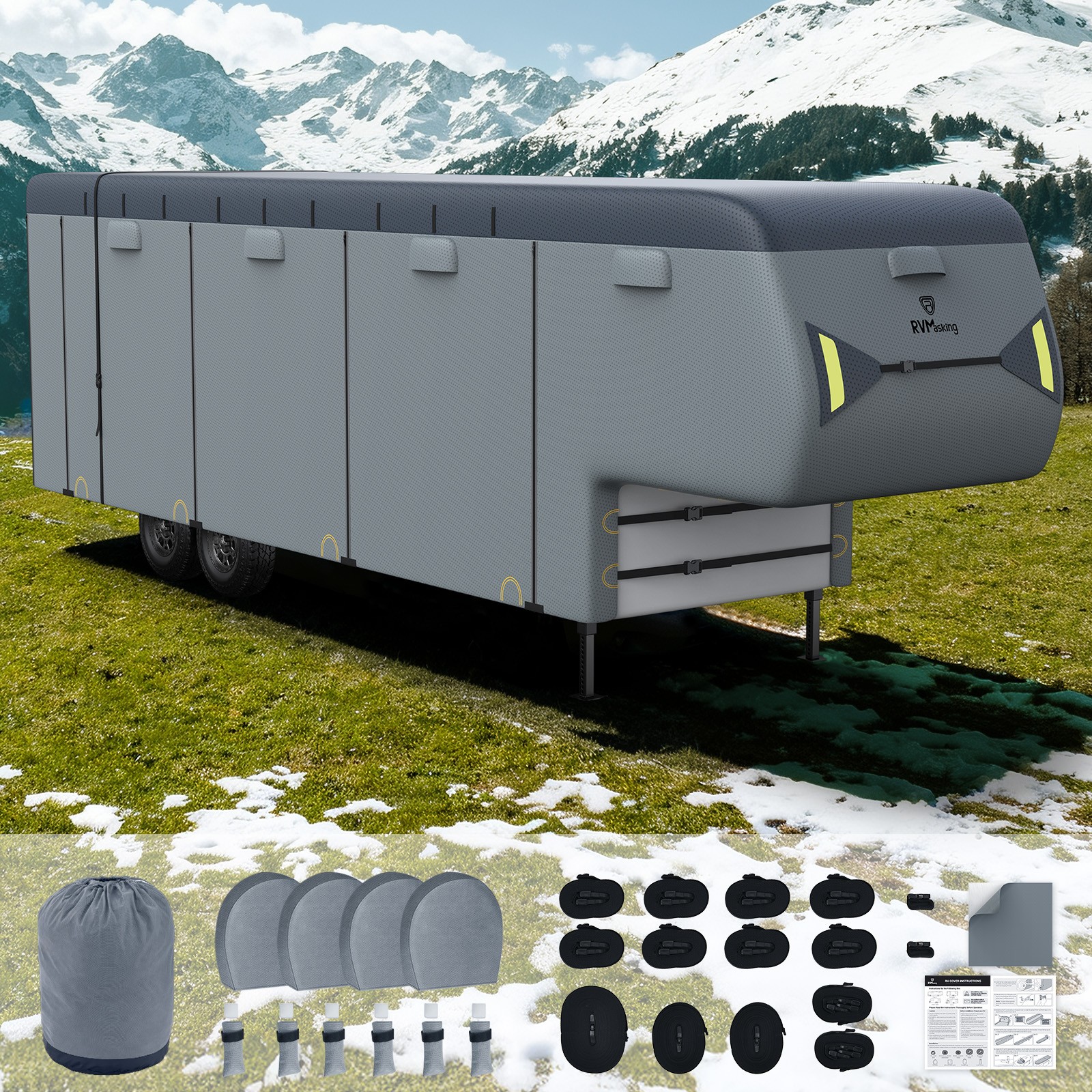 【Heavy Duty Fabric】Designed with 7 Layers of non-woven fabric on the top and 3 layers on the side, this 5th wheel rv cover provide excellent protection against UV, snow, dust, and scratches. Mixed with anti-UV composite and waterproof membrane, our 5th wheel cover offers higher anti-UV property and greater ability to prevent fabric aging, decomposition and tearing of the top fabric. 【Excellent Windproof & Custom Fit】3 extra-long straps are specially designed to ensure overall stability and better windproof performance. The inside bottom windproof straps with buckles provides easy installation and quick release, keeping your cover firmly in place to prevent the cover from blowing away. Inner designed straps are more resistant to aging than other outside windproof straps. Elasticized hem cor.